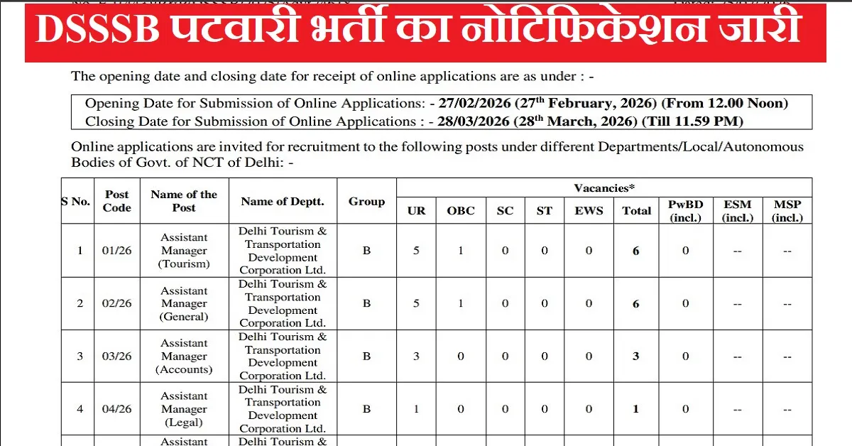 Delhi Subordinate Services Selection Board द्वारा DSSSB Recruitment Advt 02/2026 Notification जारी कर दिया गया है। इस भर्ती के तहत कुल 216 पदों पर भर्ती की जाएगी। इसके लिए ऑनलाइन आवेदन प्रक्रिया 27 फरवरी 2026 से शुरू होगी और 28 मार्च 2026 तक आवेदन किए जा सकेंगे। इस भर्ती में महिला और पुरुष दोनों अभ्यर्थी आवेदन कर सकते हैं तथा भारत के सभी राज्यों के उम्मीदवार आवेदन करने के पात्र हैं। इस भर्ती में कई Group B और Group C पद शामिल किए गए हैं।