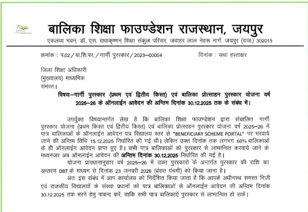 राजस्थान में गार्गी पुरस्कार योजना 2025-26 के सबंध में शिक्षा विभाग ने आधिकारिक सुचना से बता दिया है ऑफिसियल सुचन के अनुसार आवेदन फॉर्म 19 नवम्बर 2025 से भरने शुरू हो गये है आपको इसके फॉर्म भरने का समय 15 दिसम्बर 2025 तक दिया था लेकिन विभाग ने इसे बढ़ा कर 30 दिसम्बर 2025 तक कर दिया है जिसका ऑफिसियल सुचन आपको निचे बताई है :