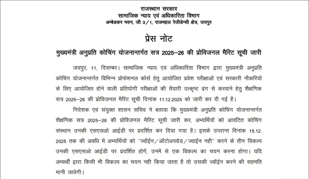 Mukhyamantri Anuprati Coaching Yojana Merit List 2025 का इंतजार कर रहे अभ्यर्थियों के लिए बड़ी खबर है। सामाजिक न्याय एवं सशक्तिकरण विभाग, राजस्थान द्वारा मुख्यमंत्री अनुप्रति कोचिंग योजना 2025-26 की प्रोविजनल मेरिट लिस्ट 11 दिसंबर 2025 को जारी कर दी गई है। जिन विद्यार्थियों ने इस योजना के लिए ऑनलाइन आवेदन किया था, वे अब अपनी SSO ID के माध्यम से आवंटित कोचिंग संस्थान की जानकारी देख सकते हैं।