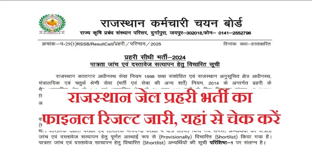 राजस्थान जेल प्रहरी 2025 का फाइनल परिणाम 30 जनवरी 2026 को ऑफिसियल रूप से जारी कर दिया है।