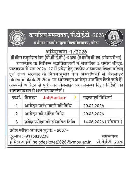 वर्धमान महावीर ओपन यूनिवर्सिटी, कोटा (VMOU) ने Rajasthan PTET 2026 के लिए ऑफिसियल नोटिफिकेशन प्रकाशित कर दिया है पीटीईटी 2026 के ऑनलाइन आवेदन फॉर्म 20 फरवरी से लेकर 20 मार्च 2026 तक भर सकते है ये फॉर्म आपको PTET की ऑफिसियल वेबसाइट के माध्यम से बीएड में प्रवेश लेने के लिए 12वी और स्तानक पास उम्मीद्ववार भर सकते है। PTET Entrance Exam 2026 को 14 जून 2026 को ऑफलाइन मोड में अलग अलग परीक्षा केंद्र पर करवाया जायेगी।