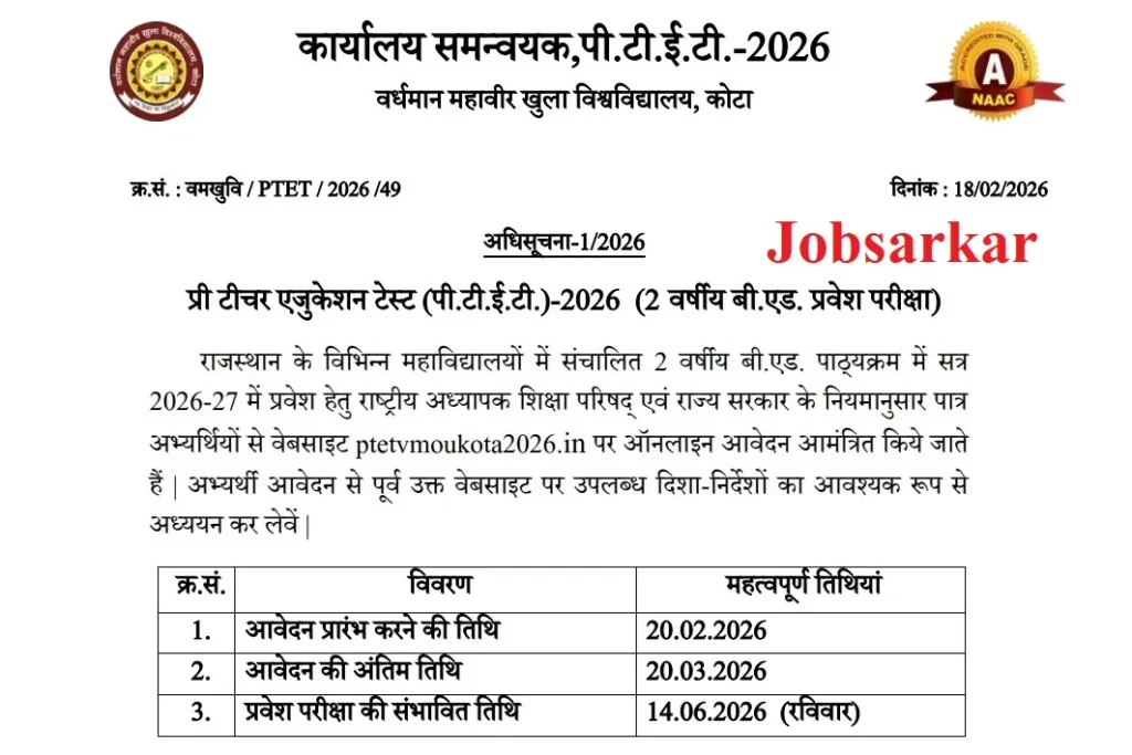 1 thought on “Rajasthan PTET Exam Date 2026 राजस्थान पीटीईटी की परीक्षा तिथि का ऑफिशल नोटिस जारी @Jobsarkar.in”