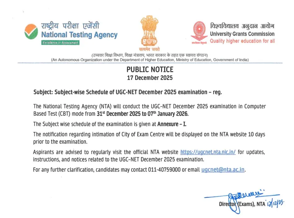 नेशनल टेस्टिंग एजेंसी (NTA) ने UGC NET December Session की परीक्षा तिथि को ऑफिसियल रूप से जारी कर दी है। एनटीए की घोषणा के मुताबिक, यूजीसी नेट 2025 दिसम्बर की परीक्षा का आयोजन 31 दिसम्बर 2025 से ०२, ०३, ०४, ०५, ०६, ०७ जनवरी 202६ के मध्य आयोजित की जाएगी। इस परीक्षा का आयोजन हर दिन दो परियो में किया जाएगा आप को निचे ऑफिसियल नोटिस उपलब्ध करवाया है।